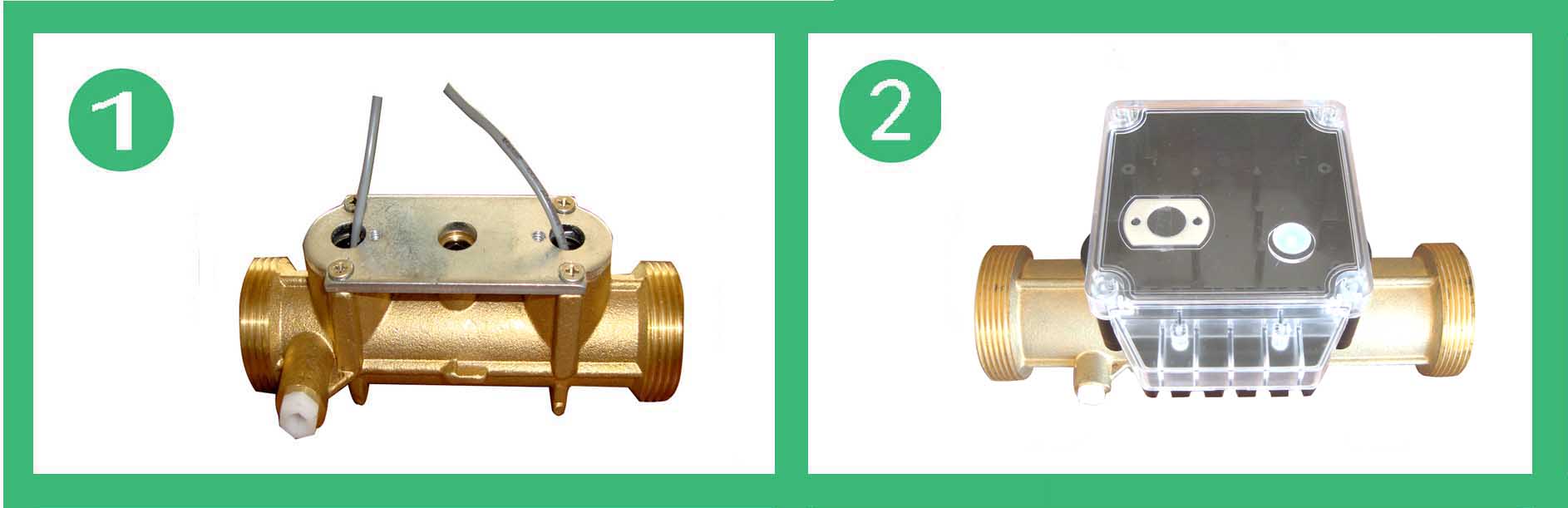 b.樓棟型熱量表超聲波流量計(jì)由表殼、換能器、換能器座組成。順流方向和逆流方向,換能器1或換能器2發(fā)射的超聲波信號(hào)由換能器2或換能器1接收。