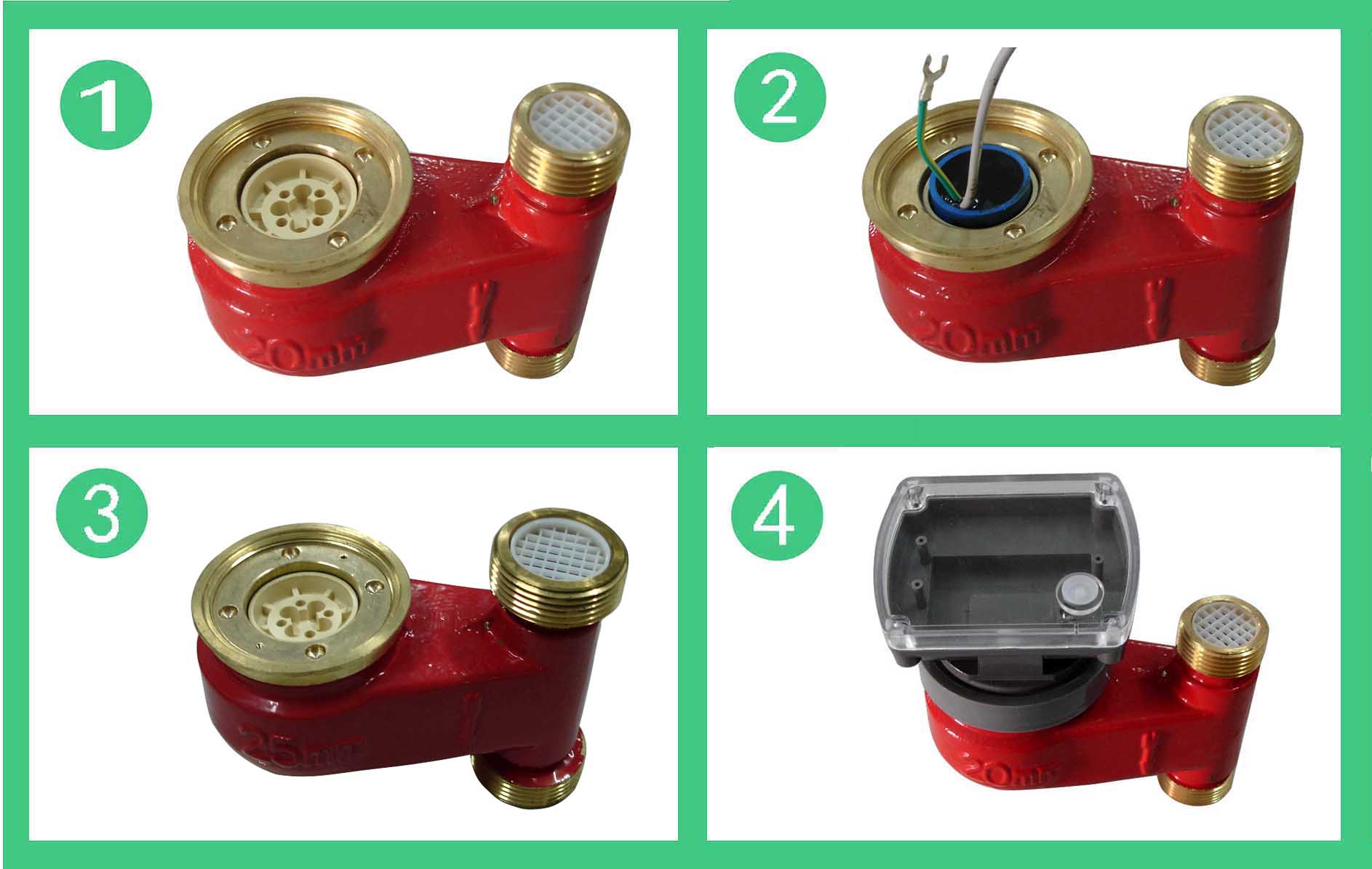 DS97TAR多流束無(wú)磁熱量表流量計(jì)的結(jié)構(gòu)如圖,其工作原理是:熱水進(jìn)入流量計(jì),經(jīng)進(jìn)水導(dǎo)向孔沖擊計(jì)量腔內(nèi)的葉輪旋轉(zhuǎn),再經(jīng)出水導(dǎo)向孔流出流量計(jì)。葉輪上面嵌有不銹鋼膜片,隨葉輪旋轉(zhuǎn),在隔板上端接近不銹鋼膜片處可裝電感類傳感器,接受葉輪旋轉(zhuǎn)的周期信號(hào)。
