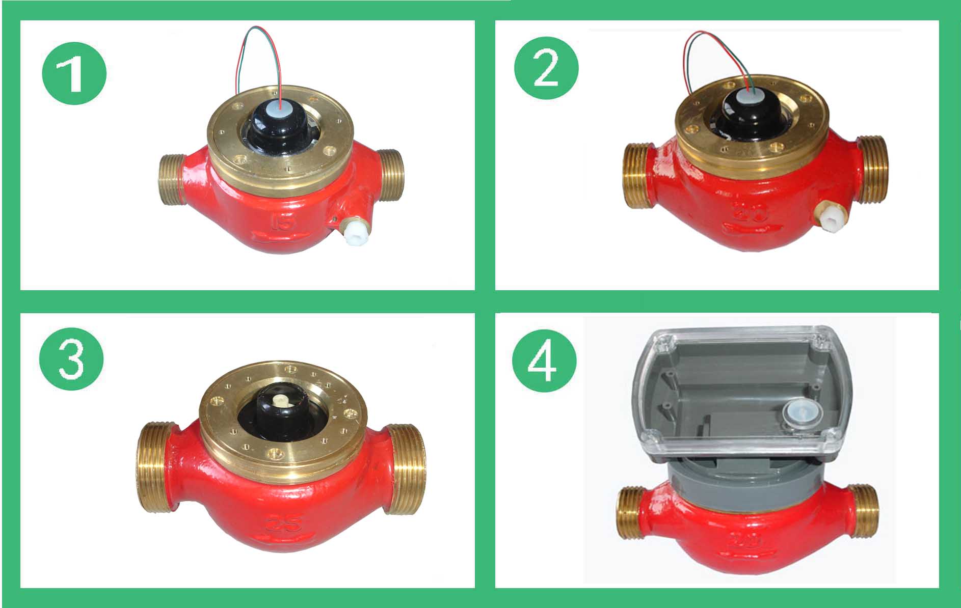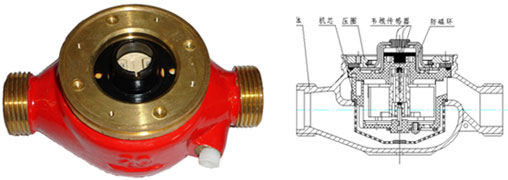 DS97TAR多流束有磁熱量表流量計(jì)的結(jié)構(gòu)如圖,其工作原理是:熱水進(jìn)入流量計(jì),經(jīng)進(jìn)水導(dǎo)向孔沖擊計(jì)量腔內(nèi)的葉輪旋轉(zhuǎn),再經(jīng)出水導(dǎo)向孔流出流量計(jì)。葉輪上面嵌有磁鋼隨葉輪旋轉(zhuǎn),在隔板上端的韋根遠(yuǎn)傳組件,接受葉輪旋轉(zhuǎn)的周期信號。其殼體采用優(yōu)質(zhì)黃銅,經(jīng)鑄造、數(shù)控機(jī)床和組合機(jī)床加工,機(jī)械強(qiáng)度好、尺寸精度穩(wěn)定一致,塑料零件選用進(jìn)口的高強(qiáng)度耐熱工程塑料,密封件采用優(yōu)質(zhì)耐熱材料。因此,該流量計(jì)完全能夠適應(yīng)國內(nèi)供熱系統(tǒng)的惡劣工作環(huán)境。