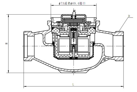 DS97TAR多流束有磁熱量表流量計(jì)的結(jié)構(gòu)如圖,其工作原理是:熱水進(jìn)入流量計(jì),經(jīng)進(jìn)水導(dǎo)向孔沖擊計(jì)量腔內(nèi)的葉輪旋轉(zhuǎn),再經(jīng)出水導(dǎo)向孔流出流量計(jì)。葉輪上面嵌有磁鋼隨葉輪旋轉(zhuǎn),在隔板上端的韋根遠(yuǎn)傳組件,接受葉輪旋轉(zhuǎn)的周期信號(hào)。其殼體采用優(yōu)質(zhì)黃銅,經(jīng)鑄造、數(shù)控機(jī)床和組合機(jī)床加工,機(jī)械強(qiáng)度好、尺寸精度穩(wěn)定一致,塑料零件選用進(jìn)口的高強(qiáng)度耐熱工程塑料,密封件采用優(yōu)質(zhì)耐熱材料。因此,該流量計(jì)完全能夠適應(yīng)國內(nèi)供熱系統(tǒng)的惡劣工作環(huán)境。
